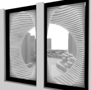 - Een ellipsvormige uitsnijding uit de wandpanelen ter hoogte van de voorpui ten behoeve van de winkeldeur.